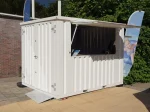O recipiente de barra dobrável branco mede aproximadamente 3 × 2 metros e possui um toldo dobrável, as dimensões são quase as mesmas que as de um recipiente dobrável de 10 pés. É ideal para as pessoas que esperam secar e dá ao recipiente a aparência de uma barra real. O toldo também pode ser bloqueado, para que o contêiner de barra possa ficar com os negócios dentro de total segurança. Além disso, há uma porta dupla no lado pequeno que permite trazer objetos volumosos como um barril de cerveja. É, portanto, a solução ideal para oferecer um bar durante os eventos. Um recipiente de barra simples, mas sólido, em uma cor elegante e limpa, como branco, Ral 9016.